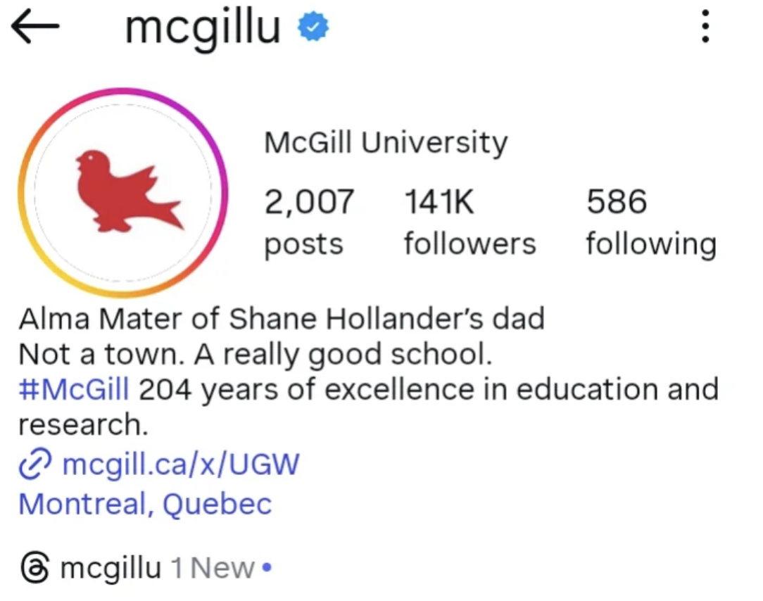 “McGill? What the fuck is McGill? Is McGill a town?” These are great questions famously posed by hockey player Ilya Rozanov. Naturally, McGill had to join the conversation and clarify in their Instagram bio that it’s actually “Alma Mater of Shane Hollander’s dad. Not a Town. A really good school.” *The bio has since been updated*